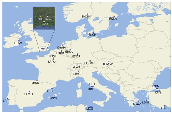 The data used are for the 25 busiest European airports—according to the 2019 European Civil Aviation Council data [12]—plus an additional five sites that (according to media reports) have already experienced either frequent noise complaints or take-off restriction issues related to short runways. Indeed, noise complaints are likely to increase in the future if increased take-off thrusts are required for runway length-limited airports. The study site ensemble is shown in Figure 1.