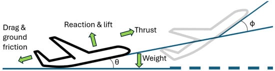 We used a method based on that of Gratton et al. [4], assuming a flat runway (no incline) for the Airbus A320 aircraft using V2500-A1 turbofan engines manufactured by International Aero Engines; Figure 2 illustrates the direction of the forces and angles involved.