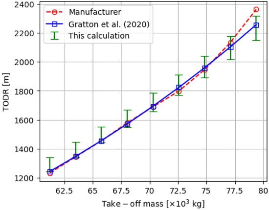 TODR as a function of mass for the Gratton et al. [4] study and for the the calculations presented here. Manufacturer values are also shown. Calculations were performed under ISA conditions and mean sea level. The numerical data from the open-access Gratton et al. study can be found in Table 1, Supplementary Material #2.