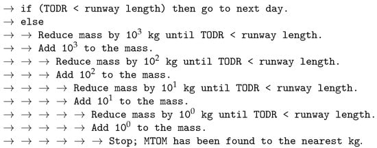 The algorithm and equations used here and in Gratton et al. [4] are, a priori, used to find the TODR for a given mass. To achieve the inverse of this—find the mass for a given TODR—the system must be inverted, and to achieve this we use a search algorithm that iteratively calculates TODR at decreasing values of take-off mass until the TODR is equal to the runway length. For every day of a model’s time series, the TODR is calculated using the daily maximum temperature and surface pressure. We then follow the steps shown in the following pseudocode description (Figure 4).