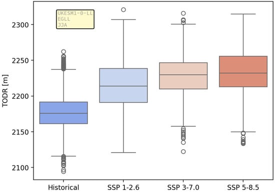 The spread of the results in Figure 9 varies considerably by airport and forcing scenario. This is especially evident for SSP5-8.5, which is partly a result of the larger spread of temperatures that results from the range of climate sensitivities in this subset of the CMIP6 model ensemble [22]. The larger spread in the temperatures, and hence TODRs, with the increased forcing seen in Figure 7 also contributes to the largest variability occurring in the fossil-fuelled development scenario, SSP5-8.5 in Figure 9.