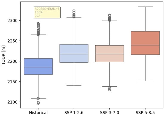 Figure 5 shows that, in general, the TODR increases with increased forcing. This is the expected first-order behaviour since warmer air will be less dense for a given air pressure, as shown in Equation (1). Note, however, that for some airport/model combinations, the median values of TODR do not always increase monotonically, as shown, for example, in Figure 6 for Brussels airport and the ACCESS-ESM1-5 model. This could be a function either of the chosen model’s forcing response (in general or for this site specifically) or the bias correction pipeline, which was used to produce the data used in this modelling exercise [14]. In general, the behaviour of this, and related, quantities will always be model-dependent due to the differing values of climate sensitivity, process parameterisations, and internal ‘structural’ model parameters [19].
