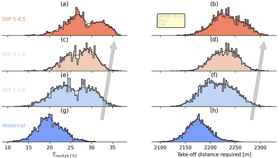 Normalised histograms (bars) kernel density estimation plots (lines) of TODR (right) and 24 h daily maximum temperature (left) for the historical period (bottom) and for increasing forcing, which increases in the vertical direction; historical (g,h), SSP1-2.6 (e,f), SSP3-7.0 (c,d), SSP5-8.5 (a,b). Data are for London Heathrow airport (ICAO code EGLL) in JJA using the UKESM1-0-LL climate model. The arrows are guides to the eye, indicating increased greenhouse gas forcing.