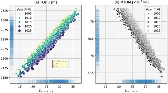 To further emphasise the point that TODR does not have a one-to-one relationship with temperature, Figure 8 shows scatter plots of TODR and MTOM as a function of daily maximum temperature and pressure for Rome Ciampino airport. The co-variability is large; indeed, for a temperature of 20 °C, the variation in TODR simply due to pressure changes is approximately 50 m, and at 30 °C, these variations can account for MTOM changes of up to half a ton (500 kg, 1100 lb).