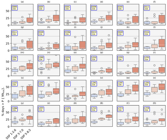 Ensemble spread of the probability of exceeding the 99th percentile of the historical distribution of TODR, JJA. Outliers (over 1.5 times the inter-quartile range of each distribution) are shown by circles. The maximum y-axis value is 1.05 times the highest value of any of the ‘whiskers’ shown. The individual subfigures (a–z,A–D) are for each airport considered and the ICAO codes for each site are shown in the top line of the respective inset boxes.