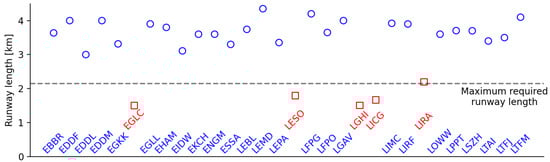 Runway lengths for each airport considered and the runway length calculated for the maximum-rated mass of the Airbus A320 using the International Standard Atmosphere. The airports that have runways shorter than or very close to the TODR for the maximum-rated mass are indicated in red and with raised ICAO codes. Those with longer runways, which will likely not be affected as temperatures increase, are indicated in blue.