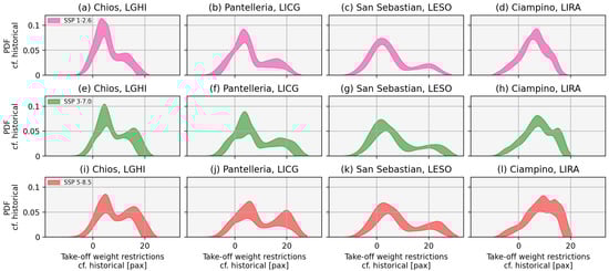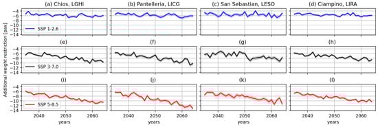 Additional weight restrictions in terms of number of passengers (‘pax’) relative to the respective historical value for four short-runway airports (columns) and three future emissions scenarios (rows). The sites considered are Chios (a,e,i), Pantelleria (b,f,j), San Sebastian (c,g,k) and Rome Ciampino (d,h,l) with the forcing increasing downwards.