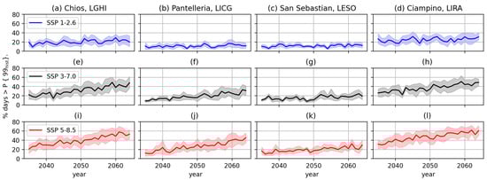 As in Figure 13 but showing the inter-model variability, ±1 standard deviation for Chios (a,e,i), Pantelleria (b,f,j), San Sebastian (c,g,k), and Ciampino (d,h,l).