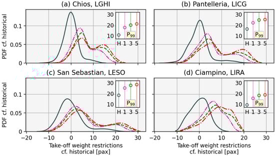 Probability density function of take-off weight restrictions relative to the historical value for each airport—Chios, Pantelleria, San Sebastian and Rome Ciampino—and emissions scenario (historical, dark grey; SSP1-2.6, pink; SSP3-7.0, green; SSP5-8.5, red). Negative values show restrictions below the respective historical mean, and hence the integral—i.e., the probability of occurrence—of the historical curve is symmetric at around zero. The smaller inset axes shows the 99th percentile values of the curves in the larger, main axes in terms of passenger equivalent weight for the historical (‘H’), and future SSP forcings (1,3,5).