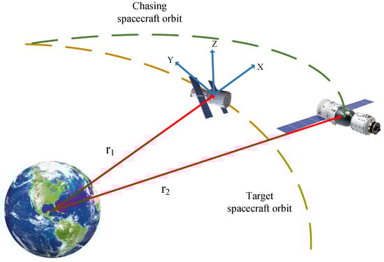 With the development of space technology, space missions are no longer restricted to the exploration of planets or other celestial bodies. Missions such as non-cooperative target tracking [1,2,3], autonomous rendezvous [4,5,6] and space debris removal [7,8] require meticulous approaching maneuver control [9] to prevent mission failure and avoid significant financial costs. Therefore, a stable and accurate space approaching maneuver control policy is critical for such missions. The space approaching maneuver is an integral part of the autonomous rendezvous mission, and it is also a prerequisite for missions such as non-cooperative target tracking and space debris removal. The spacecraft-approaching maneuver refers to the orbital and attitude adjustments of the chasing spacecraft (chaser) to progressively approach the target spacecraft (target) for further rendezvous operations.