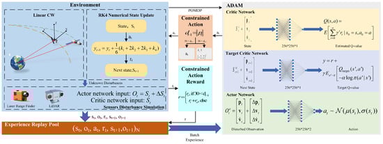 Hence, we further adjust the SAC algorithm to ensure that the proposed ADSAM algorithm is effective to provide an accurate and robust approaching maneuver policy under large-scale disturbances. Since both input and external disturbances can be formulated as the disturbances additional to the accurate state information, we directly introduce an additional noisy term to the original accurate state. As privileged information can be obtained from the simulation environment, we use accurate state information as the input of the critic network. represents the real information that can be perceived by the actor network which contains various disturbances. The disturbance is formulated as , and .