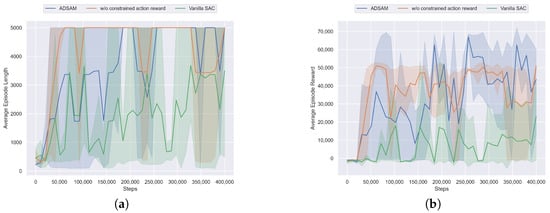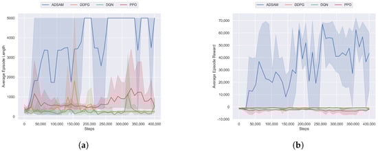 The training curves of different algorithms. Each method is repeatedly implemented with three random seeds, and the solid line is the average of the three evaluation tests. (a) Comparison of average episode length. (b) Comparison of average episode reward.