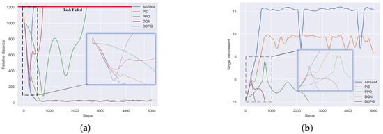 Quantitive analysis of different algorithms, task failed determines that the relative distance between the chaser and the target exceeds the maximum allowed range, and the task is determined to be failed with a large negative reward given. (a) Relative distance change curve for different algorithms. (b) Single step reward curve for different algorithms.