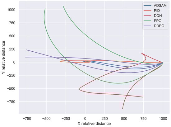 Figure 5 presents the best two trajectories generated by DDPG, DQN, PPO, and ADSAM, along with a single trajectory from PID. For PID, only its best control model is selected for comparison. The trajectories of DDPG, DQN, and PPO are divergent, indicating that these algorithms fail to accomplish the spacecraft approaching maneuver task. Both DDPG and PPO initially guide the chaser toward the target. However, in the presence of large-amplitude unknown disturbances, these algorithms fail to maintain the relative distance and quickly deviate from the expected trajectory. DQN, on the other hand, failed to successfully reduce the relative distance. As the action space of DQN is discrete with only nine options, delicate operations such as the spacecraft approaching maneuver are unable to be performed properly; hence, the trajectories generated by DQN are significantly deviated from the expected trajectory.