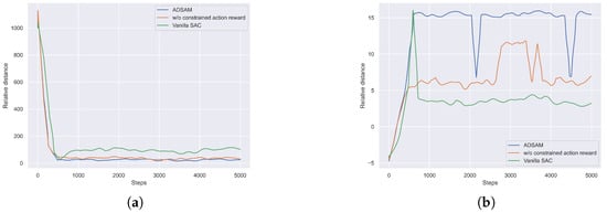 Quantitive analysis for ablation study. (a) Relative distance change curve for ablation study. (b) Single step reward curve for ablation study.
