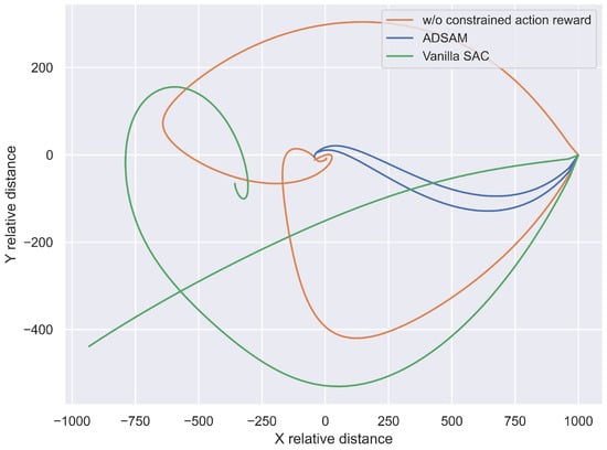 Figure 8 demonstrates the best two trajectories of the each ablation study method. As the ADSAM w/o constrained action reward method does not learn to constrain the amplitude of output action, it tends to output large-amplitude actions to increase the approaching efficiency without the consideration of overshooting. Instead, ADSAM learns to output small-amplitude actions; thus, ADSAM is able to try more action combinations during training and hence a more direct approaching maneuver process. These results demonstrate that the proposed ADSAM method is effective to complete the spacecraft approaching maneuver task with less energy consumption and a lower approaching distance error.