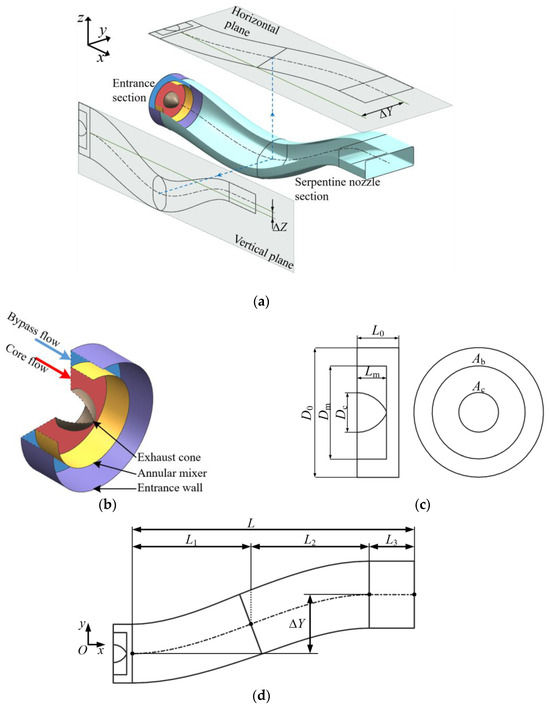 Furthermore, to address the potential significant offset between the engine axis and the nozzle exit axis along the spanwise direction, some researchers have proposed design solutions for the serpentine exhaust system to enhance aerodynamic performance. Meng et al. [24] improved the Lee curve method to design a serpentine exhaust system with vector angles and spanwise offsets. Numerical simulations demonstrated that this nozzle maintained high aerodynamic performance under critical and supercritical conditions. Zhang et al. [25] combined CFD and Taguchi methods to comprehensively analyze the selection principles of the Distribution of Area (DA), Distributions of Centerline for the first and second ‘S’ sections in the Vertical direction (DCV1 and DCV2), and Distribution of Centerline in the Spanwise direction (DCS), and pointed out that a nozzle in which DA changes rapidly at the exit and DCV1, DCV2, and DCS change rapidly at the entrance gives the best aerodynamic performance. It is worth noting that this preferred structure is only based on specific constraints for axial length (L = 4.8D0), vertical offset (ΔZ = 0.1D0), and spanwise offset (ΔY = 1.0D0), where D0 is the diameter of the nozzle inlet.
