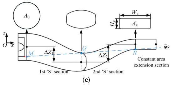 Figure 1 shows the geometric model of the serpentine exhaust system with a spanwise offset, consisting of an entrance section and a serpentine nozzle section. Figure 1b,c show the structure of the entrance section, with the entrance wall, annular mixer, and exhaust cone jointly shaping the core flow and bypass flow channels. Figure 1d,e show the projections of the serpentine nozzle section, which includes the first ‘S’ section, the second ‘S’ section, and the constant-area extension section. Two ‘S’ sections form a double serpentine centerline in the vertical direction and a single serpentine centerline in the spanwise direction, with axial lengths of L1 and L2, vertical offsets of ΔZ1 and ΔZ2, and a total spanwise offset of ΔY. ΔZ = ΔZ2 − ΔZ1 and ΔY are uniquely determined according to the layout requirements of the confined space. It is also necessary to ensure that the three points of the vertical plane projection, M, Q, and N, are collinear to fully shield high-temperature components [26]. In addition, the constant-area extension section is created by the axial extension of L3 length from the second ‘S’ section exit, which effectively constrains the direction and reduces the non-uniformity of the gas flow [21]. The values of the key geometric parameters of the serpentine exhaust system are listed in Table 1. The cross-section channel profile from a circular inlet to a 2D exit is achieved by the curvature regulation method [27]. The distribution of area is controlled by the Lee area control equation (Equation (1)), while the distribution of the centerline is governed by the Lee curve control equation (Equation (2)) [28].