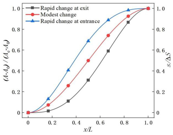 In Equations (1) and (2), L represents the nozzle axial length, and x is the streamwise location. A0 denotes the inlet area, Ae the exit area, and A the cross-sectional area at position x. ΔS represents the offset of the serpentine nozzles, and s corresponds to the offset at the x coordinate. The distributions of area and centerline governed by these equations exhibit varying rates of change. Equations #A1 and #L1 describe rapid change at the exit, #A2 and #L2 represent modest change, and #A3 and #L3 provide rapid change at the entrance. Figure 2 illustrates the trends for these cases.