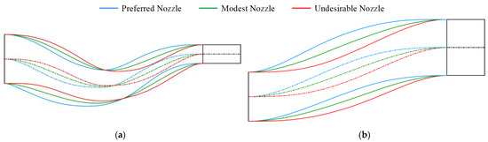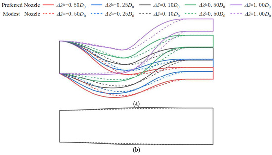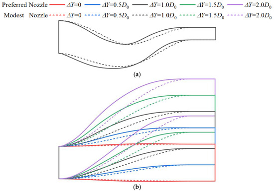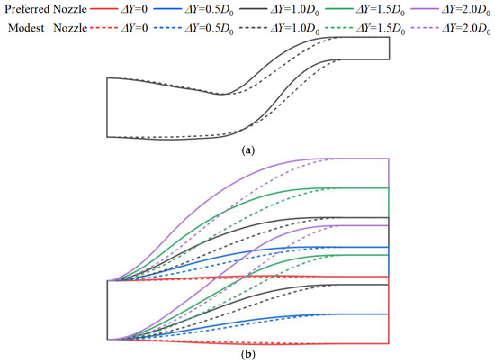 Comparisons of structures of the ‘Preferred Nozzle’, ‘Modest Nozzle’, and ‘Undesirable Nozzle’ (L = 4.8D0, ΔZ = 0.1D0, ΔY = 1.0D0). (a) Projection on the vertical plane. (b) Projection on the horizontal plane. The dashed lines of different colors represent the centerline of the corresponding nozzles.