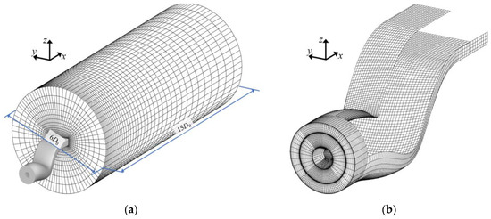 Numerical grid of the computational domain. (a) Computational domain. (b) Grids of the serpentine exhaust system.
