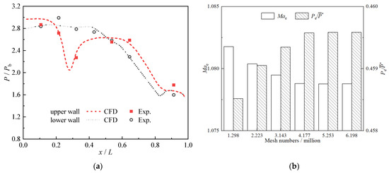 In References [18,19], six turbulence models were used to carry out the numerical calculations for the serpentine nozzles, and comparisons with experimental results indicate that the Shear-Stress Transport (SST κ-ω) turbulence model best captures the flow field details for serpentine nozzles. In addition, the flow and heat transfer control equations are discretized using a second-order upwind scheme [19]. The specified convergence criteria for the numerical solutions required the residuals of the energy equation to be less than 10−6 and the residuals of the other equations to be less than 10−4. The parallel calculations are performed on a 4.20 GHz Intel-Core (i7-7700 K) CPU with 32 GB memory. The computation time for each simulation run is approximately 38 h. As shown in Figure 5a, numerical calculations were performed based on the experimental model from Reference [19]. Results show that the calculated static pressure distribution along the upper and lower walls of the nozzle is in good agreement with the experimental results, with a maximum error of 4.67%, demonstrating the accuracy of the CFD method used in this study. As shown in Figure 5b, the results of the grid independence study based on the nozzle exit Ma and static pressure indicate that a mesh with 4.177 million cells is optimal.