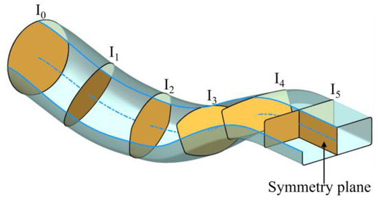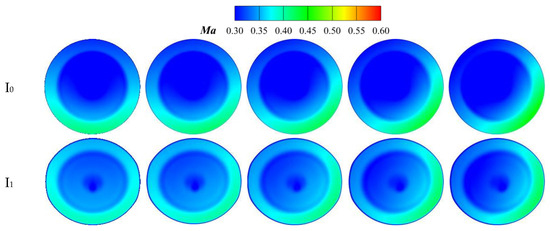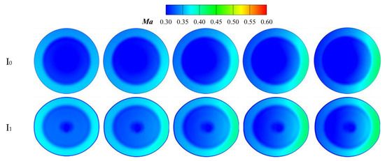 The complex serpentine structure of the nozzle subjects the gas flow to centrifugal and centripetal forces, which cause Ma at each cross-section to exhibit obviously asymmetric characteristics. When the pressure near the wall is low, the gas flow experiences centrifugal force, leading to higher speed and local acceleration. In contrast, centripetal force causes local flow deceleration. To clarify the flow characteristics inside the nozzle, six sections are established with positions of x/(L1 + L2) =0, 0.2, 0.4, 0.6, 0.8, 1.0, as shown in Figure 7. I0 and I5 represent the inlet to the first ‘S’ section and the exit of the second ‘S’ section, respectively. I1 and I2 are located in the first ‘S’ section, while I3 and I4 are located in the second. The symmetry plane refers to the symmetry plane of the constant-area extension section.