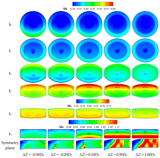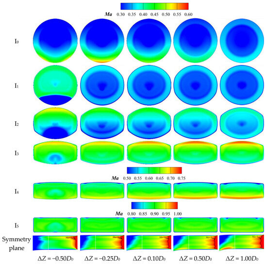 The Ma distribution of the ‘Preferred Nozzle’ characteristic sections under different vertical offsets is shown in Figure 8. Due to the slightly higher total pressure of the bypass flow compared to the core flow, the corresponding velocity of the former is also higher than that of the latter. The interface between these two can be clearly identified in the first ‘S’ section. As the flow enters the second ‘S’ section, the velocities of these two tend to be consistent. The area of the nozzle channel gradually decreases, causing the flow velocity to increase progressively. Although the area within the constant-area extension section remains unchanged, the curvature of the lower wall profile at the exit of the second ‘S’ section causes the flow tube to still exhibit a contracting state, leading to the continued acceleration of the gas flow, which approaches sonic speed near the nozzle exit. When ΔZ = −0.50D0, a local low-Ma flow develops at the lower wall of the first ‘S’ section entrance due to the constraint of complete shielding propagating downstream. A distinct recirculation zone appears within this section and gradually dissipates after Section I3. When ΔZ ≥ −0.25D0, the flow smooths out, with no recirculation zones, though differences in acceleration characteristics remain between nozzles. Specifically, as ΔZ increases from −0.25D0 to 1.00D0, the curvature of the lower wall at the nozzle entrance decreases due to the reduction in ΔZ1. This leads to a gradual reduction in the high-Ma region below Section I0. The differences in Ma distribution at Sections I1 and I2 among different models are minimal, with the most uniform distribution occurring at ΔZ = 1.00D0, where ΔZ1 is nearly zero, and there is little curvature in the wall profiles. As vertical offsets increase, the curvature of the upper wall at the exit of the first ‘S’ section grows, expanding the high-Ma region above Section I3. The curvature of the lower wall near the second ‘S’ section exit becomes more influential at Section I4, shifting the high-Ma region to the lower flow channel, with both its range and magnitude increasing as the vertical offset increases. The Ma distribution in Section I5 tends toward uniformity. In the constant-area extension section, the gas flow reaches supersonic speeds near the nozzle exit under all vertical offsets, with no local supersonic regions. In summary, within the first ‘S’ section, the ‘Preferred Nozzle’ with negative vertical offsets exhibits a more pronounced asymmetry in the Ma distribution due to its greater ΔZ1. Conversely, in the second ‘S’ section, the ‘Preferred Nozzle’ with larger positive vertical offsets demonstrates a more significant acceleration effect corresponding to the increased wall curvature. However, in the constant-area extension section, the Ma distribution shows little difference across the different vertical offsets.