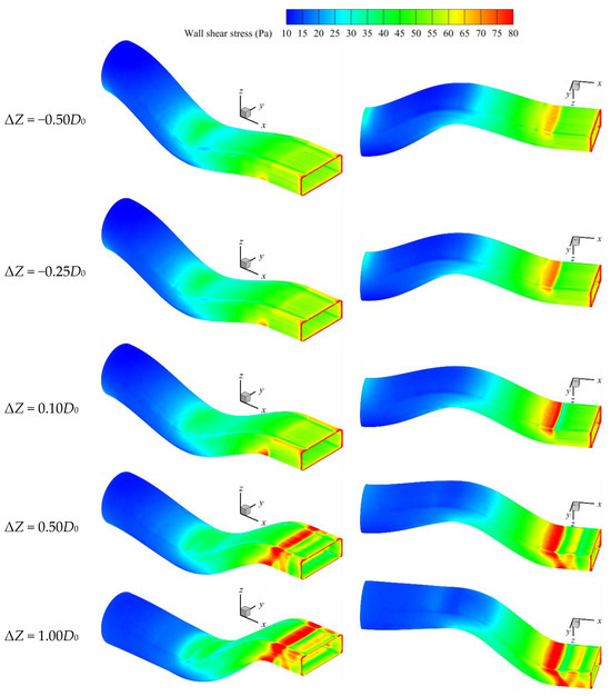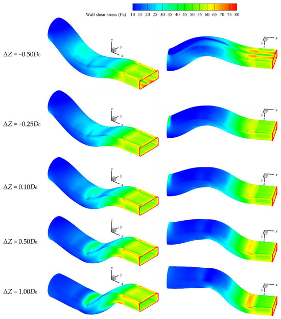 The wall shear stress distribution of the ‘Modest Nozzle’ walls under different vertical offsets is shown in Figure 11. The ‘Modest Nozzle’ has a slightly higher gas flow velocity than the ‘Preferred Nozzle’, resulting in slightly higher wall shear stress values. This difference is most noticeable in the upper wall of the second ‘S’ section. When ΔZ = −0.50D0, there is no recirculation zone present in the ‘Modest Nozzle’, so its shear stress distribution is essentially the same as those of ‘Modest Nozzles’ and ‘Preferred Nozzles’ with ΔZ ≥ −0.25D0. High shear stress regions occur at the lower wall of the first ‘S’ section entrance, the upper wall of the second ‘S’ section entrance, and the lower wall of the second ‘S’ section exit. When ΔZ ≥ 0.50D0, the high shear stress region at the lower wall of the second ‘S’ section exit extends to the upper wall of the constant-area extension section and continues downstream, forming an ‘N’-shaped distribution on the sidewalls, reflecting the expansion waves in this section.