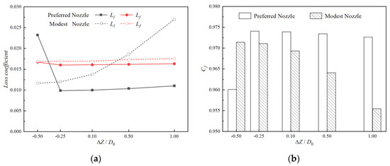 Comparisons of aerodynamic performance of nozzles with different ΔZ (ΔY = 0). (a) Comparisons of loss coefficient. (b) Comparisons of axial thrust coefficient.