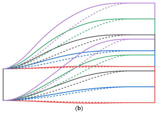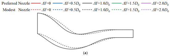 With a fixed vertical offset of ΔZ = 1.00D0, the study investigates the effect of different spanwise offsets (ΔY = 0, 0.5D0, 1.0D0, 1.5D0, 2.0D0) on the aerodynamics of serpentine nozzles. Figure 21 shows the projections of the ‘Preferred Nozzle’ and ‘Modest Nozzle’ structures on the vertical and horizontal planes. Under different spanwise offsets, the upper and lower wall profiles of the first ‘S’ section for both the ‘Preferred Nozzle’ and ‘Modest Nozzle’ are largely consistent, with the flow channel remaining nearly horizontal. This is due to the minimal vertical offset required in this section to meet the shielding constraint at ΔZ = 1.00D0. However, in the second ‘S’ section, the large vertical offset (ΔZ2) creates a noticeable difference between the two nozzles, significantly impacting the transition from the lower wall at the section exit to the constant-area extension section. The projection of these models on the horizontal plane also aligns with the nozzle at ΔZ = −0.50D0, which is not discussed further here.