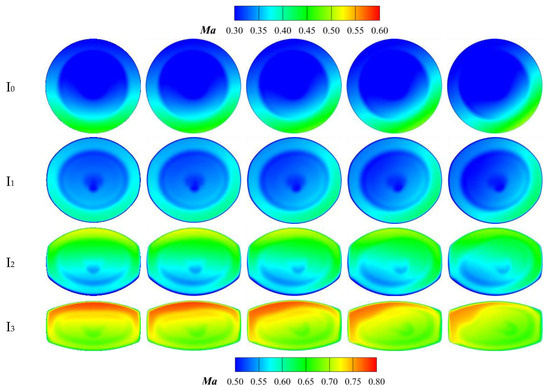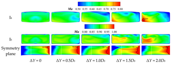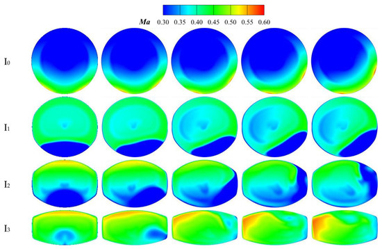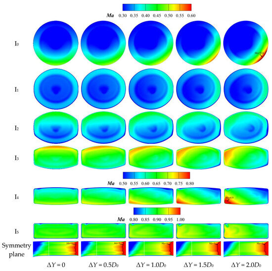 The Ma distributions of the ‘Preferred Nozzle’ and ‘Modest Nozzle’ characteristic sections under different spanwise offsets are shown in Figure 22 and Figure 23, respectively. The Ma distribution in Sections I0, I1, and I2 of both nozzles is nearly symmetrical in the vertical direction. However, due to the curvature of the left and right walls, the high-Ma regions shift to the right or left sides in each section for the serpentine nozzle with a spanwise offset (ΔY > 0). Compared to the ‘Preferred Nozzle’ with ΔZ = 0.10D0, the Ma distribution of the ‘Preferred Nozzle’ with ΔZ = 1.00D0 is nearly identical in Sections I3, I4, I5, and the symmetry plane of the constant-area extension section. Compared to the ‘Modest Nozzle’ with ΔZ = 0.10D0, the Ma distribution of the ‘Modest Nozzle’ with ΔZ = 1.00D0 is similar in Sections I3, I4, and I5. However, the larger vertical offset of the second ‘S’ section causes a more extensive and higher high-Ma region at Section I5 for the ΔZ = 1.00D0 nozzle. In the constant-area extension section, the supersonic flow nearly fills the entire channel, and its wave structure becomes more complex. Notably, when the spanwise offset is small (ΔY = 0, 0.5D0), the two small supersonic regions disappear, replaced by a right-leaning expansion wave that continuously reflects within the constant-area extension section. This causes significant local losses, leading to a notable decline in aerodynamic performance.