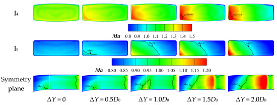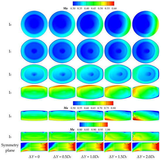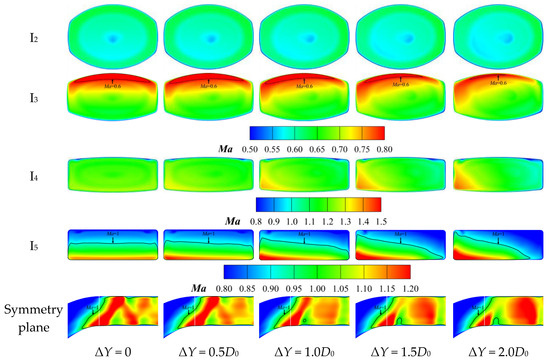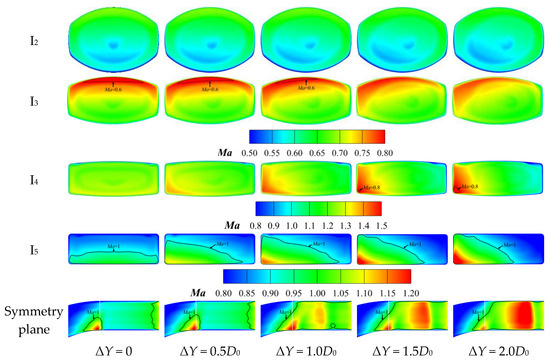 Comparisons of section Ma contours of nozzles with different ΔY (ΔZ = −0.50D0, Modest Nozzle).