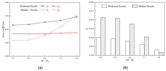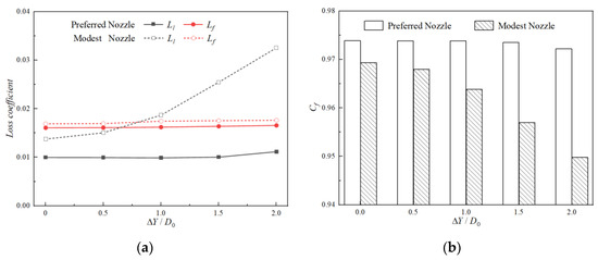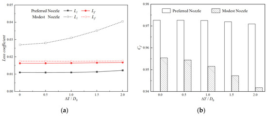 Comparisons of aerodynamic performance of nozzles with different ΔY (ΔZ = −0.50D0). (a) Comparisons of loss coefficient. (b) Comparisons of axial thrust coefficient.