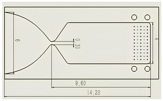 As previously mentioned, the geometry is etched into silicon carbide, resulting in a high aspect ratio and a rectangular cross-section. The distance from the throat to the exit is 4.6 mm, with a throat width of 0.3 mm and a nozzle depth of 1 mm. The combustion chamber is 9.6 mm long and 4.0 mm wide. The exit width is 1.5 times that of the combustion chamber, yielding an exit width of 6 mm. In this design, the expansion ratio is set to 20, with the exit width being the upper limit of the design. This constraint aims to control the overall size of the thruster. Subsequent simulations will investigate the effects of wider exit widths on performance.