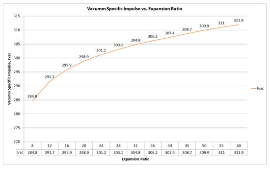 Specific impulse growth with an expansion nozzle calculated by CEARUN. The growth of specific impulse slows down when expansion ratio reaches around 20.