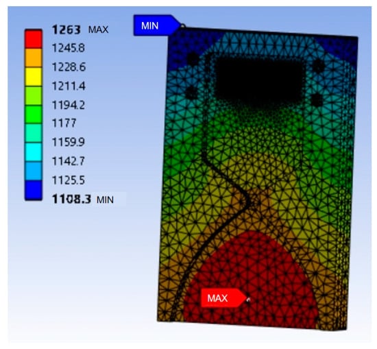 The simulation result, listed in Table 9, shows that the highest temperature in the structure is less than 1300 °C. The average value is 1160 °C and the highest temperature on the structure is 1263 °C. This is much lower than the temperature the silicon wafer can withstand. This indicates the fact that the thruster still has a large thermal potential to withstand combustion with higher temperatures and performance. The results of the visualization are also shown in Figure 14.