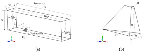 Currently, hypersonic vehicles have emerged as pivotal focal points in the strategic technology competition landscape, with the propulsion system standing out as a key developmental technology. Scholars widely acknowledge that the scramjet presents the most promising propulsion scheme for hypersonic vehicles, offering a combination of simplicity in structure, cost-effectiveness, and favorable attributes such as high specific impulse and thrust–mass ratio [1,2]. The time frame for supersonic airflow within a scramjet engine is remarkably short, lasting less than 2 milliseconds. Consequently, achieving efficient mixing and ignition of fuel within this brief interval poses a significant challenge, particularly in maintaining flame stability [3]. Enhancing the penetration depth and mixing characteristics of fuel within the combustor represents a substantial hurdle for large-scale scramjet engines [4,5,6,7]. The primary design objective for the fuel injection scheme in a scramjet combustor is to facilitate thorough mixing of fuel and air, enhance jet penetration depth, and minimize overall pressure loss. Consequently, the meticulous design of a fuel injection scheme that aligns with these objectives is of paramount importance [8,9,10,11,12]. Presently, researchers have conceptualized a range of jet structures aimed at augmenting mixing effects, including struts, cavities, pylons, aero-ramps, and others [13,14,15,16,17,18,19,20,21,22]. Extensive research has been conducted in this realm, with the study of pylons, although initiated relatively recently, garnering increasing attention in recent years.