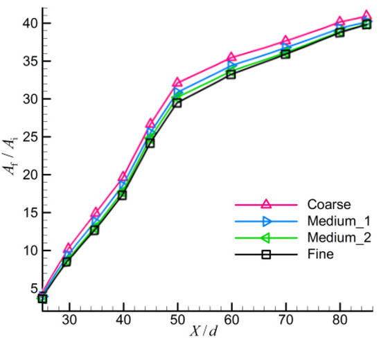 Grid refinement study with basic configuration, where Af is the cross-section area with the equivalence ratio (Φ) between 0.4 and 5.5, Ai is the orifice area, and X is the distance from the cross-section to the entrance of the combustor.
