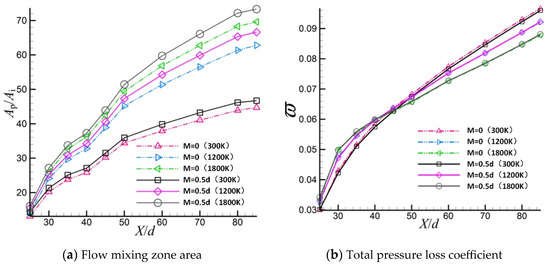 Additionally, the mixing zone of the flow field, denoted as Ap, is defined as the cross-section area with the equivalence ratio . The incoming flow conditions are set with a Mach number (Ma) of 2, total pressure (Pt) of 850 kPa, static pressure (P) of 108 kPa, and mass fractions (oxygen ratio) and (nitrogen ratio) of 23.2% and 76.8% for the components. At the ethylene injection nozzle, Pt is set to 2 MPa, and the static pressure P is set to 1.4 MPa. To verify the setting of the incoming total temperature, two cases with M equal to 0 and 0.5d are conducted, obtaining the flow mixing zone area [23] and total pressure loss coefficient [27] under different total temperatures as shown in Figure 4. The conclusions drawn under the inflow conditions of 300 K are applicable to inflow conditions of 1200 K and 1800 K, with more distinct differences in total pressure loss, facilitating simulation optimization studies. Furthermore, research substantiates that cold flow fuel/air mixing profiles effectively estimate diffusive flame behavior in scramjet combustors [38]. Therefore, the inlet total temperature Tt is set at 300 K.