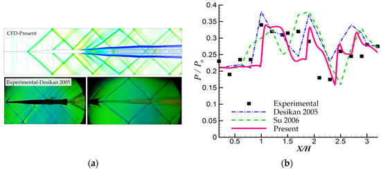 The experimental configuration from Reference [43] was adopted as a benchmark case to validate the accuracy of the numerical methodology employed in this study. To rigorously assess the model’s predictive capability, simulation results generated by the proposed framework were compared against both experimental and numerical data from Desikan [43] and Su [44]. Contour plots of pressure and ethylene mass concentration derived from CFD simulations are juxtaposed with experimental schlieren images in Figure 5a. Figure 5b presents the comparison of the wall pressure distribution on the combustor’s upper surface. It is evident that the numerically predicted wave structures exhibit excellent agreement with the experimental flow visualization, and the static pressure distribution simulated by the model in this study aligns well with the experimental results. This validation attests to the capability of the computational model employed in this study to effectively simulate the supersonic flow field within a combustor featuring pylons.
