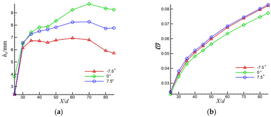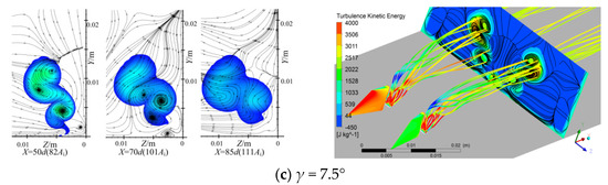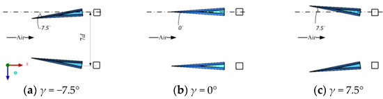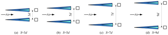 In the literature [45], the use of two thinner and sharper pylons at a certain angle has been employed as an alternative to traditional micro-vortex generators, yielding favorable results. Inspired by this idea, this study explores the impact of the spanwise combination angle in double-pylon combinations on flow field characteristics. The objectives are twofold: first, to optimize the flow field performance of the spanwise combination, and second, to analyze the influence of angular installation on the performance of jet injection devices in practical engineering applications. Figure 9 illustrates schematic diagrams of double-pylon combinations with different angles, where the pylon spacing (S) is fixed at 7d. The angle includes −7.5° (converging type), 0° (parallel combination), and 7.5° (diverging type).