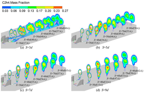 Figure 7 presents ethylene component contour plots and isolines in the flammable mixture zone for different cases on a sliced cross-section. The areas of the flammable mixture zone (Af) and orifice area (Ai) are indicated in brackets below the slice, as Figure 7c shows. The sliced cross-section of the flow field mixing zone (Ap) is divided into regions I and II. When S = 3d, the region II of the two jet flows quickly merge into one, and the region I expands and occupies both sides. There is a notable presence of ethylene components on the lower wall, but the uplifting effect of fuel components along the trajectory is not very apparent. As the pylon distance S increases, the ethylene components on the lower wall significantly decrease, and the initial overlap of flammable mixture zones from different jets gradually shifts backward. At the X = 80d cross-section, the flammable mixture zones of the cases with S/d = 7 and 9 no longer overlap, and Ap zoning is evident. Regarding the area of the flammable mixture zone, at the X = 30d cross-section, the case with S = 3d achieves a larger area (17Ai) compared to other cases. At the X = 80d cross-section, the areas of Af for the cases with S/d = 7 and 9 are comparable. This indicates that when S is small, the mixing characteristics near the rear edge of the pylon are favorable but the far-field mixing characteristics are poorer.