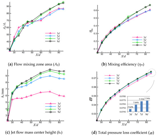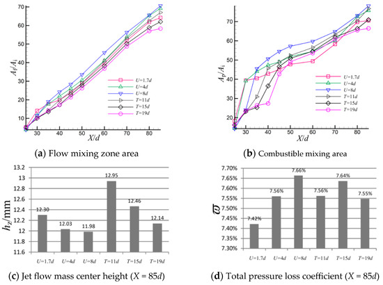 Figure 8 illustrates the curves of flow field mixing zone area (Ap), mixing efficiency (), jet mass center height (hz), and total pressure loss coefficient () for different cases. Before X = 50d, the variations of Ap and with S are not clearly defined. After X = 50d, the cases with S/d = 7 and 9 exhibit larger flow field mixing zone areas and higher mixing efficiency. The jet mass center height (hz) increases with the growing S, but the rate of increase diminishes. Considering the data on the exit section, it is observed that the total pressure loss coefficient slightly increases with the enlargement of S. To more accurately determine the appropriate distance for spanwise pylon combinations, the case with S = 6d is added. Table 1 provides a comparison of mixing efficiency and total pressure loss coefficients for different distances (S). As the pylon spacing increases, there is a tendency for mixing efficiency to rise, but the correlation is not strictly positive. After S/d = 6 and 7, the increase in mixing efficiency becomes less pronounced. Simultaneously, beyond S/d is greater than 6, the magnitude of the total pressure loss increase diminishes with the increasing S. In summary, within the range of S/d = 6~7, the combustor can achieve good mixing performance, effective lifting of fuel components, efficient utilization of channel space, and not result in significant total pressure loss. Therefore, in the subsequent research, the distance S will be controlled within the range of 6d~7d.