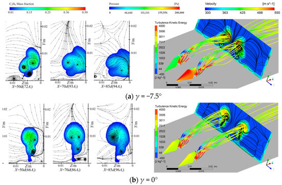 Figure 10 displays ethylene component contour plots of the flow field mixing zone (Ap) at X/d = 50, 70, and 85 for different cases. The Figure includes streamline plots, pylon surface pressure distribution plots, jet streamlines (color-coded by velocity values), turbulent kinetic energy contour plots with streamlines on the X = 45d cross-section, and ethylene component contour plots with the corresponding areas in parentheses. At the X = 50d cross-section, compared to the parallel combination, cases with γ = −7.5° and γ = 7.5° generate a higher number of streamwise vortices, indicating that the converging and diverging combinations introduce additional disturbances, increasing the complexity of the flow field. The difference in the distribution of streamwise vortices leads to variations in the ethylene component distribution. Except for the parallel combination, other combinations no longer exhibit distinct upper and lower zones in the Ap area. The converging combination has a lower average position of the vortex core, restricting the uplifting effect during downstream development. Regions I and II eventually merge into one, with a relatively uniform spatial distribution but close to the lower wall. The Ap areas of the two jets mutually entrain, and the streamlines significantly converge towards the symmetry plane, limiting the diffusion of fuel throughout the entire channel. The distribution of high-intensity turbulent kinetic energy, the ethylene component, and the position of the streamwise vortex core are consistent among all cases. In the parallel combination, the distribution of ethylene components in regions I and II is distinct, with fuel mainly concentrated in region II, and the component distribution is farther from the lower wall. The diverging combination exhibits rapid development of the streamwise vortex; the disturbance quickly extends throughout the entire flow field, and the streamlines of the two jets disperse significantly to both sides. Comparing the Ap areas, it is evident that the converging and diverging combinations provide better near-field mixing effects. As the flow field develops downstream, the diverging combination performs the best. This may be attributed to the fact that the diverging arrangement not only generates additional disturbances but also encourages more incoming flow to enter between the two pylons, effectively increasing the distance (S) between the two orifices. Comparing the pressure distribution on the pylon surface reveals that both the converging and diverging combinations exhibit high-pressure regions on the outer side and the inner side of the pylons, respectively. This results in additional total pressure loss and cooling burdens.