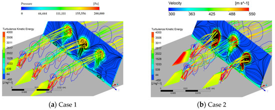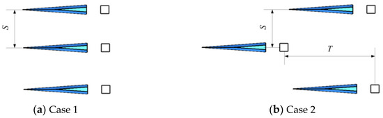When employing multiple pylons for injection it is essential to consider the impact of the pylon arrangement on flow field characteristics. The relative positions of the pylons can be determined by the spanwise distance (S) and the streamwise distance (T): when S = 0, it represents a streamwise combination; when T = 0, it indicates a spanwise combination; and when S ≠ 0 and T ≠ 0, it is a diagonal combination. As per the previous studies, the flow field characteristics of multi-pylon streamwise combinations are less than ideal; hence, they are not considered. To compare the effects of multi-pylon spanwise combinations and diagonal combinations on flow field characteristics, a three-pylon spanwise combination (case 1) and a diagonal combination (case 2) are set up, as shown in Figure 14. In each case, the leading edge of the pylons is 35 mm away from the entrance of the combustor.
