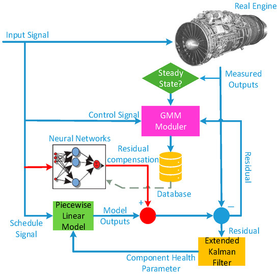 The eSTORM structure, proposed by Volponi et al. on the basis of the STORM structure, includes a piecewise linear model, extended Kalman filter, GMM (Gaussian Mixture Model) module, which includes a real-time clustering algorithm and database, and neural network units. The eSTORM structure is represented in Figure 1.