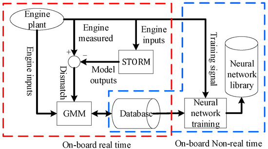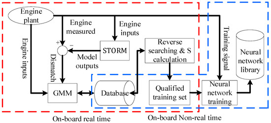 In Figure 9, the elements in the GMM database were first processed by the reverse searching algorithm, then S was calculated. And the qualified training set of the neural networks was generated according to the preset S threshold value. These calculations were carried out on-board in real time. This qualified training set would be used to train the neural networks at the end of every flight cycle. The rest of Figure 9 is the same as Figure 2.