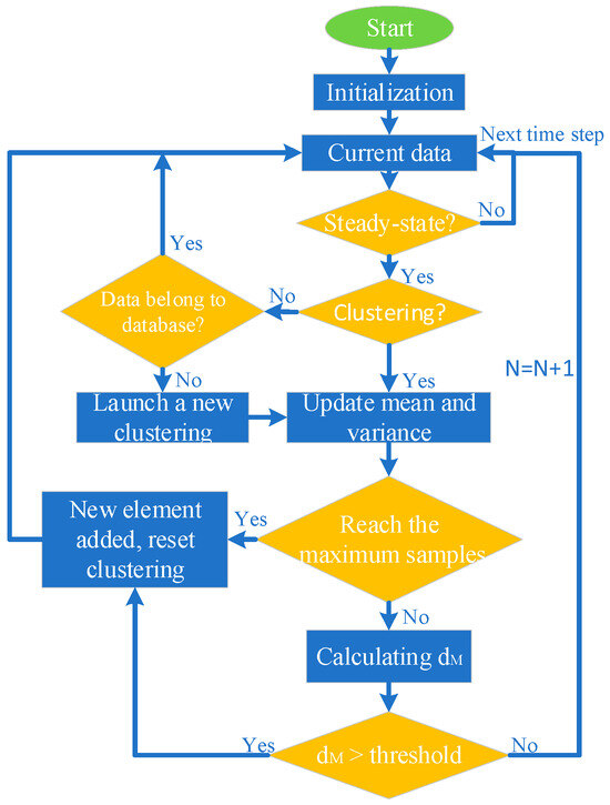 where indicates the Mahalanobis distance; denotes the sample data at the current time, including control inputs and discrepancies between model and engine outputs; denotes the elements that are already in the database; indicates the length of data vector; denotes the mean value of while is the standard deviation; and refers to the noise sensitive factor of the -th data element, which is used for adjusting the order of magnitude of MD. GMM calculates the MD between the sampled data at the current time and all database elements, and if the smallest distance is still greater than the preset threshold, a new clustering process is launched. The clustering program calculates the mean and standard deviation of the control inputs and output residuals in a certain operating period to construct a new element. In this paper, the GMM module only processes the data of steady-state, so before calculating the Mahalanobis distance, it is necessary to determine whether the engine is in a steady-state condition. The flow chart of the Gaussian clustering algorithm is shown in Figure 3.