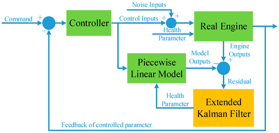 In Figure 1, the piecewise linear model represents the behavior of the engine near the steady-state operating point. The piecewise linear model is scheduled in an entire engine operating envelope, and the scheduling parameters usually include environmental parameters (altitude, Mach number) and engine state parameters (low pressure rotor speed, nozzle throat area, etc.). The residuals between the piecewise linear model outputs and the engine sensor outputs are sent to the Kalman filter, which estimates the engine state and health parameters. The component health parameters are fed back to the piecewise linear model for increasing model accuracy.